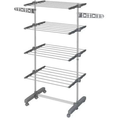 General description Easy clothes drying with the HOMCOM Large Clothes Airer, designed to accommodate plenty of just-washed items. This multi-rack drying rack features four middle shelves and two rotating wings, providing ample space for your laundry. Its compact design allows for easy storage, as all levels and legs can be moved downwards or inwards. Equipped with six wheels for easy mobility, the airer also includes two brakes to keep it stationary when needed. Technical specifications Colour: Grey and Silver Tone Materials: Stainless Steel, ABS, PP Overall Dimension: 142L x 55W x 172H cm Folding Dimension: 80L x 13W x 172H cm Weight Capacity: 30 kg (Overall), 15 kg (Shelf), 3 kg (Hook) Item Label: 850-295V00GY Height of drying space: 64.8 cm Usage Ideal for drying clothes indoors or outdoors. Adjustable height shelves and rotating arms allow for versatile drying options. Easy to assemble and use.