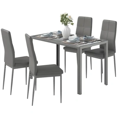 HOMCOM 5 Piece Kitchen Dining Table Set with 4 Faux Leather Metal Frame Chairs Glass Tabletop Desk for Room, Kitchen, Dinette, Grey