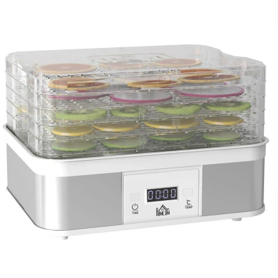General description Dehydrate fruit, vegetables, and other ingredients with the HOMCOM 5 Tier Food Dehydrator. This versatile machine allows you to dry food at the optimal temperature for specific items, ensuring delicious and healthy results. Technical specifications Colour: White Material: Stainless Steel, PS, ABS Overall Dimension: 32L x 25W x 26H cm Tray Size: 31L x 23W x 3.5H cm Cable Length: 1m Weight Capacity: 5kg Power: 245W Voltage: 220-240V, 50-60Hz Dehydration rate: 90% when drying ingredients up to 12 hours Usage Five stacking trays included for organizing and separating different foods Ideal for creating food and drink garnishes at home, best for fruits and vegetables, suitable for some meats and breads Features 360° air circulation for even dehydration Temperature adjustable between 40℃ and 70℃ Timer sets between 1-48 hours for convenience LCD display for easy monitoring and setting adjustments
