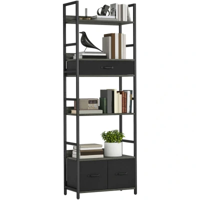 General description An easy way to showcase your favorite home pieces in a striking and on-trend style, the HOMCOM Industrial Bookshelf combines a dark wood-effect and black design to bring character into your space. It features four shelves for ample open display and three fabric drawers for convenient hidden storage. Technical specifications Colour: Grey, Black Material: Particleboard, Fabric, Metal Overall Dimension: 60W x 30D x 176H cm Shelf Dimension: 56W x 28.3D x 26H cm Drawer Dimension (Large): 56L x 28W x 12.5H cm (Large), 28L x 28W x 26.5H cm (Small) Maximum Load: 50 kg (Overall), 10 kg (Shelf), 3 kg (Drawer) Item Label: 838-594V00CG Installation Easy to assemble Usage Great for use all over the home: living room, bedroom, study, and hallway Fabric drawers are foldable if not in use Other information Anti-tipping straps included in the package Adjustable foot pads for stability Powder-coated metal frame for a strong core