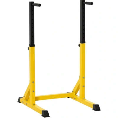 General description Whether it’s at home, the office, or the gym, this workout station from HOMCOM will take your strength workouts to the next level. Built from super-strong, heavy-duty steel, it is extremely sturdy and can handle a weight of up to 100kg. Adjustable to ten different heights, it can be completely catered to you and your workouts, providing your own space to do push-ups, dips, knee raises, abdominal crunches, and much more. Four non-slip rubber pads sit on the feet to keep the station stable and secure on the floor, and it is finished with foam grips to keep your hands comfortable during extended workout periods. It’s a powerful addition to help you work out in true professional style. Technical specifications Item Name: Dip Station Brand Name: HOMCOM Colour: Yellow and black Material: Steel pipe, PVC Net Weight: 14kg Product Dimension: 83.5L x 71.5W x 96-126H cm Weight Capacity: 100kg Other information Assembly required