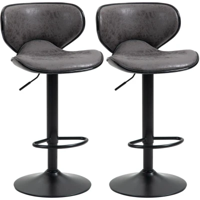 HOMCOM Adjustable Bar Stools Set of 2, Swivel Leathaire Upholstered Barstools with Large Seat, Breakfast Chairs Back, Footrest and Steel Base, Dark Grey