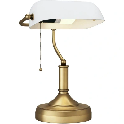 HOMCOM Banker's Table Lamp Desk with Antique Bronze Tone Base, White Glass Shade and Pull Rope Switch for Home Office, Living Room, Bedroom, Dining