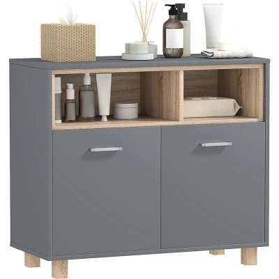 General description Discover the stylish HOMCOM bathroom cupboard, a flawless blend of modern design and practicality. Its dual storage compartments and cabinets offer ample space, while the chic grey finish and natural wood grain detail add a contemporary touch to any bathroom. Enjoy the convenience and enhanced stability provided by non-slip foot pads, making it excellent for organizing all your bathroom essentials! Technical specifications Colour: Grey Material: MDF Overall Dimensions: 70H x 80W x 35D cm Open Compartment Size: 16.5H x 28W x 32D cm (right), 16.5H x 44W x 32D cm (left) Cabinet Inner Size: 40H x 37.6W x 32D cm Bottom to Floor Height: 7.5 cm Weight Capacity: 70 kg (total), 30 kg (tabletop), 10 kg (shelf) Item Label: 834-741V00GY Other information Open compartments and cabinets offer versatile storage options Sleek bar pull handles designed for a contemporary look Stainless steel hinged doors enhance durability Non-slip foot pads provide added stability Anti-tipping kit