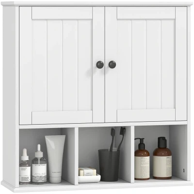 General description Discover the charm of farmhouse elegance with the HOMCOM bathroom wall cabinet. Its beadboard doors and classic detailing add a timeless touch, while the flexible storage options, including a double-door cabinet, three open compartments, and an adjustable shelf, keep your essentials tidy and accessible. Mount the storage cupboard on the wall to save space and bring structured grace to your bathroom. Technical specifications Colour: White Material: MDF Overall Dimension: 60W x 19.5D x 60H cm Cabinet Inner Size: 55.5W x 16D x 38H cm Lower Shelf Size (Single): 17.7W x 17.5D x 18H cm Weight Capacity: 29 kg (overall), 10 kg (cabinet shelf), 3 kg (single lower shelf) Item Label: 837-657V00WT Installation Wall mounting saves floor space and keeps the bathroom tidy. Assembly required. Usage Double-door cabinet with an adjustable shelf offers flexible storage options. Three open compartments ease access to frequently used products. The door catch allows for secure, easy