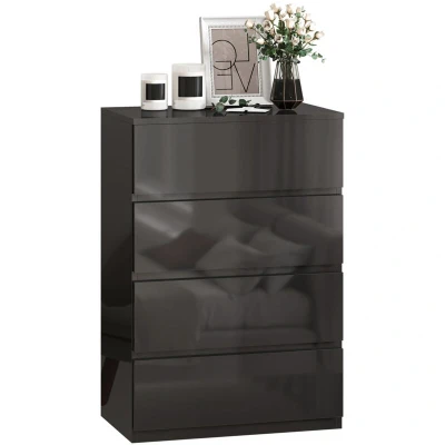 Fresh, spacious and simple, this HOMCOM chest of drawers is the only way to keep your clothes stored and organised. It comes with four drawers, so there's plenty of space for keeping a variety of clothes and more stored. Look to its high gloss finish for style - the colour is versatile, so it can be matched with other colours easily. A handle-less design creates a sleek, modern look with smooth drawer operation. Specifications: ● Colour: High Gloss Black ● Material: Particle Board ● Overall Dimension: 55W x 34D x 80Hcm ● Drawer Inner Size: 47L x 28.5D x 8Hcm ● Weight capacity: 30kg (overall), 5kg (drawer) ● Item Label: 831-337V88BK Features: ● Four drawers: storage space for organising clothing and more. Metal rails to open/close drawers smoothly ● Handle-less design and high gloss finish for a sleek and modern look ● Cushion damping guideway makes soft closing and prevent fingers from being pinched ● Melamine particle board structure: Suitable for everyday use and easy to maintain ●