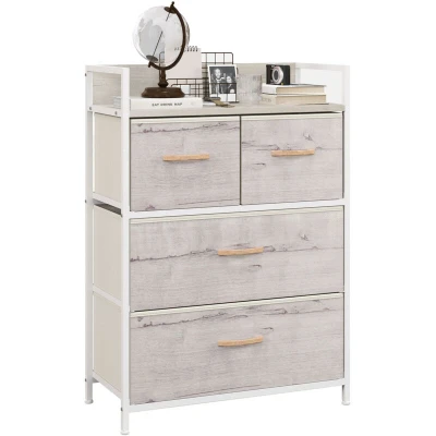 AmazonFour drawers: Fabric chest of drawers offers room for ornaments, accessories and more. Drawers can be removed and folded. Top shelf: Extra display space on the bedroom drawers. Show off your favourite ornaments. Steel frame: Powder coated for extra strength, ensures a supportive core for storage drawers. Adjustable feet for balance. Industrial look: Faded wood-effect finish of this dresser for a minimal, pared-down design - a natural and rustic feel. Dimensions: 85H x 60W x 29Dcm. Easy to assemble.