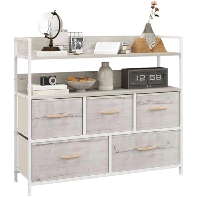 AmazonFive drawers: Fabric chest of drawers offers room for ornaments, accessories and more. Drawers can be removed and folded. Two shelves: Extra display space on the bedroom drawers. Show off your favourite ornaments. Steel frame: Powder coated for extra strength, ensures a supportive core for storage drawers. Adjustable feet for balance. Industrial look: Faded wood-effect finish of this dresser for a minimal, pared-down design - a natural and rustic feel. Dimensions: 85H x 98W x 29Dcm. Easy to assemble.