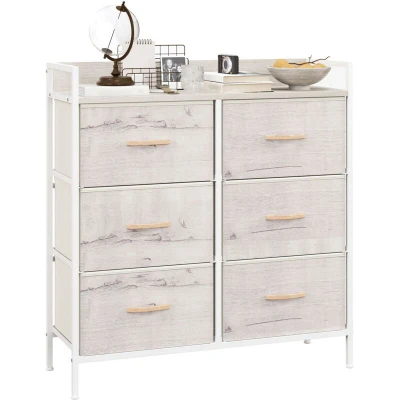 AmazonSix drawers: Fabric chest of drawers offers room for ornaments, accessories and more. Drawers can be removed and folded. Top shelf: Extra display space on the bedroom drawers. Show off your favourite ornaments. Steel frame: Powder coated for extra strength, ensures a supportive core for storage drawers. Adjustable feet for balance. Industrial look: Faded wood-effect finish of this dresser for a minimal, pared-down design - a natural and rustic feel. Dimensions: 85H x 79W x 29Dcm. Easy to assemble.