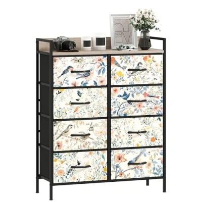 Elegant look: This chest of drawers features exquisite patterns on the drawer panels, making it a stylish addition to bedrooms, living rooms, or home offices Eight drawers: Fabric chest of drawers offers plenty of storage for various items. Drawers can be removed and folded Wood-effect top: Extra display space on the dresser. With side rails and a raised back panel, ensures your items don't slip off Powder-coated steel frame: Provides a strong core for the drawer unit. Equipped with adjustable foot pads for balance and anti-tipping kit for enhanced safety Dimensions: 79W x 29D x 101H cm. Maximum load: 35 kg. Assembly required