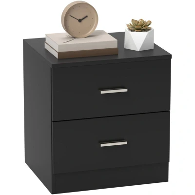 Modern boxy organisation for your bedside - this nightstand from HOMCOM. Comes with two drawers for generous amount of storage. Made from particle board, structure is reliable, in a clean black finish for versatility. Smooth finish is easy to clean. It's finished with sleek metal handles to open and close both drawers easily. Specifications: ● Colour: Black ● Material: Particle Board ● Overall Dimension: 45W x 39.5D x 49Hcm ● Drawer Inner Size: 36L x 28D x 10Hcm ● Bottom Board Height: 8cm ● Weight Capacity: 30kg (overall), 5kg (each drawer) ● Item Label: 831-425V80BK Features: ● Black simple design is versatile and modern. Suitable for plenty of home spaces! ● Two sliding drawers with handles to open/close easily ● Flat top for display space ● Particle board structure is reliable, smooth finish ● Maximum load 30kg, assembly required