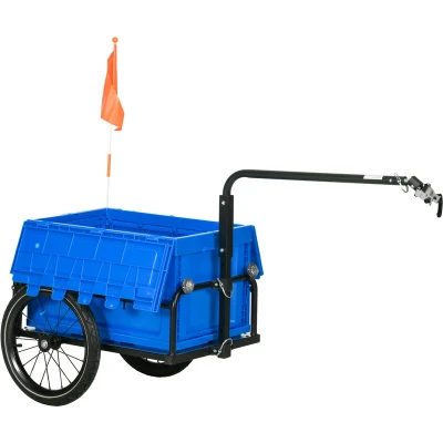 General description This HOMCOM Bicycle Trailer is designed for safety and convenience while transporting your items. It features a foldable storage box with a capacity of 65 liters, making it ideal for smaller items. The trailer is equipped with a red flag, reflectors, and reflective strips on the wheels to enhance visibility during movement. Built with a sturdy steel frame and large pneumatic tyres, it ensures smooth transportation. Technical specifications Colour: Blue Materials: Steel, PP Overall Dimensions: 145L x 61W x 76/81H cm (without red flag) Detach and Store Dimensions: 67L x 48W x 26H cm Cargo Compartment Dimensions: 65L x 44W x 15/21H cm (20H cm from bottom to ground) Plastic Storage Box Dimensions: 60L x 40W x 36H cm Rear Seat Post Clip Height: 76 cm, 81 cm Distance from Clip to Cargo Box: 67L cm Wheel Size: φ40.6 cm, 4.4W cm Weight Capacity: 40 kg Item Label: B71-061V00BU Compatibility and accessories Fits 19-35 mm seat posts 65 litre removable and foldable storage box