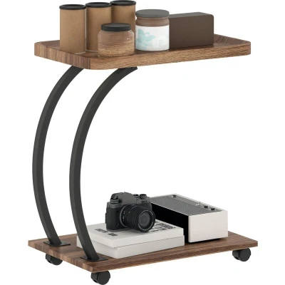 HOMCOM C Shaped Side Table with Storage, Mobile 2 Tier Bedside Tray Top, Wheels, Steel Frame for Living Room, Bedroom, Brown