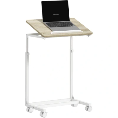 HOMCOM C Shaped Sofa Side Table, Height Adjustable Overbed Table with Tilting Desktop, Mobile Laptop Desk for Living Room Bedroom, Oak and White