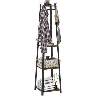 General description This HOMCOM clothes rack features a multi-functional design with eight double hooks, three lower shelves, and an upper shelf, providing ample space for coats, bags, shoes, and other accessories, all in one convenient location. Its trapezium shape allows it to fit snugly into corners, making it perfect for smaller spaces throughout the home. Technical specifications Colour: Black, Rustic Brown Materials: MDF, Steel Overall Dimensions: 42L x 42W x 170H cm Hanging Height: 168/120 cm Top Shelf Size: 20L x 20W cm Middle Shelf Size: 34L x 34W x 40H cm Bottom Shelf Size: 38L x 38W x 5H cm Weight Capacity: 40 kg (total), 5 kg (shelf), 2 kg (hook) Other information Features eight double hooks for jackets, scarves, bags, and hats Includes three lower shelves and one small top shelf Constructed with a powder-coated steel frame for strength and durability Equipped with anti-tipping straps for secure wall attachment Adjustable feet for balance Assembly required