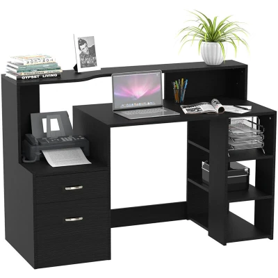 General description This HOMCOM Multi-Storage & Workstation Desk Table is designed to elevate your office work setup. It features a multi-use design with three side shelves, a two-drawer storage cabinet, a spacious worktop, and a high back, providing ample space for working and storing essentials in a compact area. The desk is finished with stylish metal accents, making it a perfect addition to any workspace. Technical specifications Colour: Black Materials: MDF, metal sliding rail Dimensions: 92H x 137L x 55D cm Table top dimensions: 97L x 55W cm Printer table top dimensions: 39.6L x 54.5W cm Partition board rack length: 137 cm Left partition board width: 30 cm Right partition board width: 20 cm Top drawer dimensions: 14H x 38W cm Bottom drawer dimensions: 34H x 38W cm Right shelf dimensions: 51L x 27W cm Weight capacity: 50 kg Other information This item ships and arrives in separate boxes. Box quantity: 2. Assembly required.