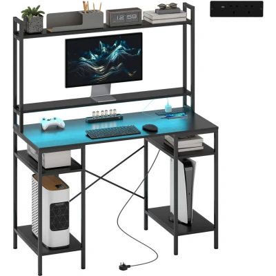 HOMCOM Computer Desk with Power Outlets and LED Lights, Home Office Monitor Stand 2 CPU Stands, Study Table Gaming Hutch, Black
