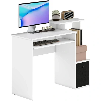General description This HOMCOM computer desk boasts a unique design that combines functionality with style. It features a moderately-sized tabletop, a sliding keyboard tray, an open side shelf, and a bottom drawer, providing ample space for work and organization of papers and supplies. Made from durable particle board, the desk is finished with a smooth melamine coating to protect against light marks from daily use, and includes a soft fabric drawer for discreet storage. This desk is perfect for home or office spaces that desire a distinctive look. Technical specifications Brand: HOMCOM Colour: White Material: Particle board Overall dimensions: 86.6H x 100W x 40D cm Desktop dimensions: 72.5H x 75.5L x 40D cm Small shelf dimensions: 86.6H x 45L x 30D cm Keyboard tray dimensions: 67.3L x 25D cm Drawer dimensions: 31.2H x 23W x 37.8D cm Maximum load: Whole desk: 50 kg; Compartment: 20 kg; Small shelf: 5 kg Installation Assembly required Usage Ideal for home, office, bedrooms, and other
