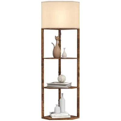 HOMCOM Corner Floor Lamp with Shelves, Modern Tall Standing Chain Switch for Living Room, Bedroom, Bulb Not Included, Rustic Brown