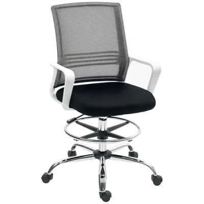 ManoManoGeneral description Discover the comfort of the HOMCOM Draughtsman Chair, featuring an adjustable seat height for tailored positioning. This high office chair includes a foot ring for added support and a breathable mesh cover with lumbar support to keep you cool and comfortable. Suitable as a perching stool or workshop stool, it's the smart choice for any workspace. Technical specifications Colour: Black Material: Mesh Fabric (100% Polyester), Foam, Plastic Overall Dimension: 58W x 58D x 103-123H cm Seat Dimension: 47W x 48D x 55-75H cm Back Size: 44W x 50L cm Armrest Height to Seat: 17 cm Foot Ring Height: 21-41 cm Overall Weight Capacity: 120 kg Item Label: 921-825V70BK Usage Tilt function to gently rock back and forth for a break Adjustable seat height and foot ring height enhance comfort and posture Breathable mesh cover paired with lumbar support for back relief Mid-density foam padding offers cushioned, supportive seating Swivel seat and wheels allow easy mobility around