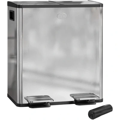 Double the compact hygiene, for the kitchen and beyond: this HOMCOM 20L double kitchen pedal bin. Made from stainless steel, this is a piece suited for everyday use the two-compartment design allows you to separate waste as needed. Place deodorisers in the lid slots to keep the smell fresh, with a stay-open option for super easy cleaning. So, when you feel stuck on space, go for this small but mighty dual rubbish bin. Specifications: ● Colour: Silver Tone ● Materials: 410 Stainless Steel, PP Plastic ● Overall Dimension: 45.8L x 36W x 51.6Hcm ● Volume: 2 x 20L ● Item Label: 851-033V05SR Features: ● 2 x 20L capacity: dual bin holds plenty and can separate items however you need ● Stainless steel structure makes double bin robust. Sleek polished finish. Resists fingerprint marks for hygiene ● Removable inner buckets, with a hole to fix bin bag for easy cleaning ● Pedal operation opens lid easily. Lid can stay open when needed too ● No assembly required