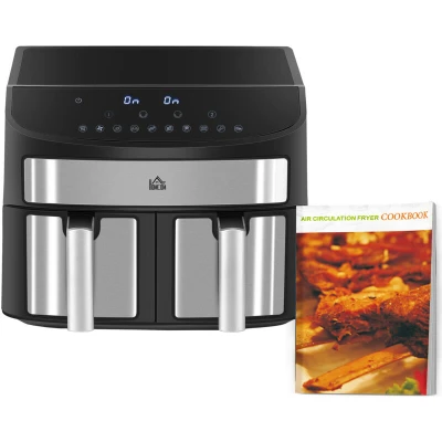 The HOMCOM Dual Air Fryer boasts a sleek and compact design, making it ideal for kitchens where space is at a premium. Despite its powerful capabilities, this air fryer is energy-efficient, consuming minimal electricity compared to traditional ovens. Its stylish black finish, crafted from durable steel and polypropylene, seamlessly blends into any kitchen decor.