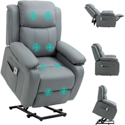 General description This HOMCOM power lift recliner chair is designed to assist individuals with knee, back, and mobility issues. With a simple touch of the remote, you can transition from standing to sitting at a comfortable 45° angle. The chair features eight massage points and six vibration massage modes with three intensity levels, allowing you to customize your relaxation experience. It also boasts a reclining back that goes up to 160°, providing the perfect position for reading, watching TV, or resting. Technical specifications Colour: Grey Material: PU Leather, Steel, Sponge Overall Dimension (Upright): 82W x 90D x 106H cm Reclining Dimension: 86W x 157D x 84H cm Lifting Dimension: 86W x 85D x 135H cm Seat Dimension: 48W x 50D x 48H cm Input Voltage: 100-240V, 50/60Hz Output Voltage: 29V/58W Power Cord Length: 1.5 m Weight Capacity: 130 kg Item Label: 713-091V70GY Usage Ideal for individuals with mobility challenges Remote control operation for easy adjustments Massage function