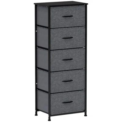 General description The HOMCOM 5 Drawer Fabric Chest of Drawers is an ideal solution for home storage. With five spacious fabric drawers, it provides ample space to keep your t-shirts, tops, bottoms, and other items organized. The wood-effect top adds extra display space for your favorite photos or decorative items. Technical specifications Colour: Dark Grey, Black Material: MDF, Non-woven Fabric, Steel Overall Dimensions: 45W x 30D x 116H cm Inner Drawer Size: 39W x 27D x 20.5H cm Top Size: 45W x 30D cm Elevated Base Height: 4 cm Weight Capacity: 3 kg (per drawer), 10 kg (top) Item Label: 850-267V00BK Other information Features a wood-effect top for display Includes five fabric drawers for organization Constructed with a powder-coated steel frame for durability Equipped with adjustable feet for balance Assembly required Comes with anti-tipping straps for safety Suitable for use in various settings, including home and office