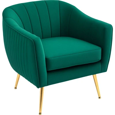 General description Look to this living room armchair to infuse luxury into everyday life. The tub-shaped design provides ample sitting room, complemented by a thick padded seat for comfort. The wide back and armrests offer additional support, while the velvet-feel upholstery in a beautiful green color adds to its aesthetic appeal. The chair is supported by metal legs and features back indents for a shell-like appearance. Technical specifications Colour: Green Material: Velvet (100% Polyester), Sponge, Metal Overall Dimension: 71W x 72D x 73H cm Seat Dimension: 47.5W x 51D x 48H cm Max Load: 125kg Flat Pack: Yes Custom Label: 833-725V71DG Other information Features: Elegant, shell-shaped design; Velvet-feel upholstery; Thick padded seat; Metal legs with adjustable foot pads; Simple assembly required.