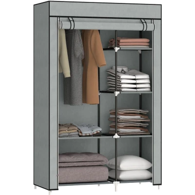 HOMCOM Fabric Wardrobe, Portable Wardrobe with 6 Shelves, 1 Hanging Rail, Foldable Closets, 103 x 43 162.5 cm, Light Grey