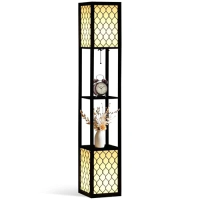 Amazon2-in-1 design: Standing lamp with a light doubles as a storage unit. Great for living rooms, hallways and bedrooms. Two shelves: The living room lamp features shelves, allowing plenty of room for storage or displaying your possessions. Beautiful top and bottom lamp: A warm and inviting glow. Chain switch on this tall lamp for top lamp. Footswitch for top and bottom together. E27 bulb base, maximum 40W - bulbs not included. Sturdy: Floor lamp with shelves is made from MDF - suitable for everyday use in your home. Smooth and protective melamine coating to finish. Dimensions: Whole: 160H x 26L x 26W cm. Shelf: 26Lx 26W x 39H cm. Maximum load 5kg per tier. Assembly required.