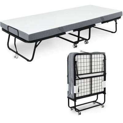 HOMCOM Folding Bed with 10cm Mattress, Portable Foldable Guest Sturdy Metal Frame on Wheels