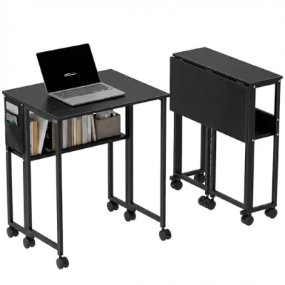 HOMCOM Folding Desk with Storage Shelf and Bag, 63 cm Foldable Computer for Small Spaces, Space Saving Writing Table on Wheels Home Office, Bedroom, Easy Assembly, Black