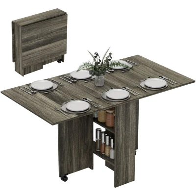 General description The HOMCOM Folding Dining Table is a versatile drop leaf table designed for small spaces. It features two-tier shelves for additional storage and comes with rolling casters for easy mobility, making it an ideal choice for compact kitchens or dining areas. Other information
