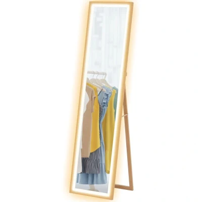 HOMCOM Full Length Mirror with LED Lights, 160 x 40cm Free Standing Dimming and 3 Colour Lighting, Leaning or Wall Frame for Living Room, Bedroom, Oak