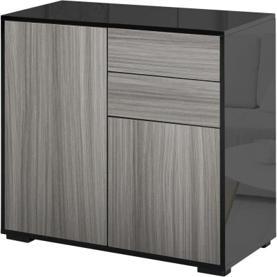 General description This small sideboard from HOMCOM is a durable and stylish addition to every home, keeping your space clean and tidy with ease. It features a push-click design for quick and effortless opening and closing of drawers and cabinet doors. The elevated base allows air to flow through for freshness, making it an effortless way to bring sleek style into your living space. Technical specifications Colour: High Gloss Black (frame), Light Grey Grain (panel) Material: Particle board Overall Dimension: 79W x 36D x 74H cm Drawer Inner Size: 31.5W x 28.5D x 6H cm Small Cabinet Inner Shelf: 37.1W x 30.2D x 19.5H cm Big Cabinet Inner Shelf: 37.1W x 32.2D x 33/35H cm Weight Capacity: 50 kg (total), 5 kg (each drawer) Usage Great for storing dinnerware, glasses, books, and more Suitable for the living room, dining room, bedroom, and home office Other information