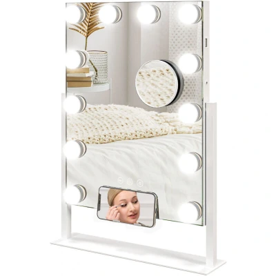 HOMCOM Hollywood Vanity Mirror with Lights, 37x46 cm Lighted Makeup 3 Colour, 12 LED Bulbs, 10X Magnifying, USB Charging Port, Phone Holder, 360 Rotation, Touch Screen