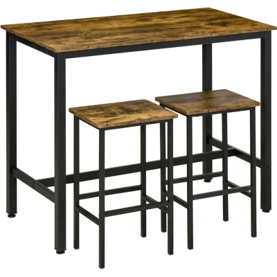 JoybuyThe Homcom Bar Table&2 Stools Industrial Rustic Brown/Black is a stylish three-piece dining set featuring a sturdy metal frame and rustic wood-effect tops, perfect for small spaces. The stools tuck neatly under the table, making it ideal for kitchens, home bars, or compact dining areas.
