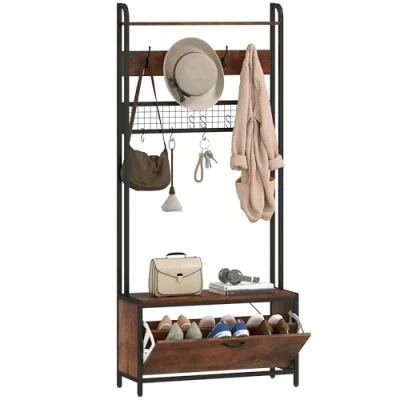 ManoManoGeneral description The HOMCOM Industrial Hall Tree Coat Rack Stand combines functionality and style, featuring a rustic brown finish that enhances any entryway. This versatile piece offers ample storage for coats, shoes, and other essentials, making it an ideal addition to your home. Other information