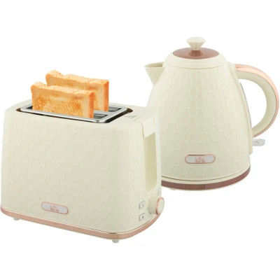 General description A matching, complementary kitchen starts here with the HOMCOM Kettle and Toaster Set. This stylish set includes a 1.7 litre rapid boil kettle and a two-slice toaster, both featuring a chic honeycomb pattern design. Technical specifications Colour: Beige Material: PP, Stainless Steel Kettle Dimension: 24.2L x 19.5W x 23.4H cm (with base) Toaster Dimension: 27.4L x 17.7W x 18.8H cm Each Slot Size: 13.5L x 3.5W x 13.5H cm Maximum Size for Bread: 12L x 12W x 1.5D cm Kettle Capacity: 1.7L Voltage: 220-240V, 50/60Hz (toaster, kettle) Power: 780-930W (toaster), 2520-3000W (kettle) Current: 3.5-3.87A (toaster), 11.45-12.5A (kettle) Cable Length: 0.7m (toaster, kettle) Certification: UKCA+CE(EMC), ROHS, UKCA+CE(LVD), ERP, LFGB Item Label: 800-181V70BG Usage Kettle can make up to six cups of tea, ideal for gatherings. Toaster features seven browning levels to customize your toast. Toaster has defrost, reheat, and cancel options for versatile use. Kettle includes an easy-read