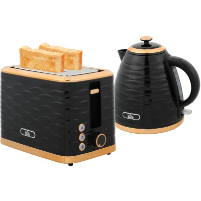 General description A matching, complementary kitchen starts here with the HOMCOM Kettle and Toaster Set. This stylish set includes a 1.7 litre rapid boil kettle and a two-slice toaster, both featuring a ridged texture with a glossy finish and chrome-coloured accents for a chic, polished look. Technical specifications Colour: Black Material: PP Kettle dimensions: 24.1L x 19.5W x 23.2H cm (with base), 24.1L x 19.5W x 21.7H cm (without base) Toaster dimensions: 25.5L x 16.7W x 18.5H cm Each slot size: 13.5L x 3.5W x 13.5H cm Maximum size for bread: 12L x 12W x 1.5D cm Kettle capacity: 1.7L Voltage: 220-240V, 50-60Hz (kettle, toaster) Power: 780-930W (toaster), 2520-3000W (kettle) Cable length: 0.7m (kettle, toaster) Certification: LFGB UKCA+CE (LVD), UKCA+CE (EMC) ROHS ERP Item label: 800-162V71BK Usage Kettle can make up to six cups of tea, ideal for gatherings. Toaster features seven browning levels to customize your toast. Toaster includes defrost, reheat, and cancel options for
