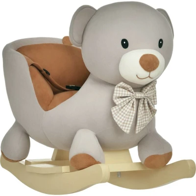 General description Let them glide back and forth in the cutest way possible with this rocking Bear seat from HOMCOM. The plush padded design ensures extreme comfort, while the high back and sides, combined with an attached seat belt, keep your little one secure during playtime. The rocking frame is crafted from solid wood in a gentle curved shape, allowing smooth movement, and it features a sound button on the ear for added fun. Technical specifications Item name: Kids Bear Rocking Horse Brand: HOMCOM Colour: Grey Materials: Plush, wood, and steel Dimensions: 50H x 60L x 33W cm Seat height: 28 cm Weight capacity: 40 kg Net weight: 3 kg Other information Recommended age: 18-36 months Requires 3 x LR44 batteries (included) Certifications: EN71 and EN62115 Flat pack: Yes Features an easy-grip front handlebar and footrests for safety Fixed sound button on ear that makes roaring sounds when pressed