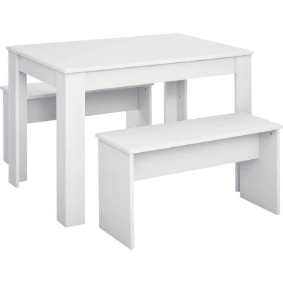 General description This dining set from HOMCOM fuses modern and minimal style, making it a perfect addition to your home. Crafted from particle board, the table and two bench seats feature a clean-cut design that can be dressed up or left as is, offering versatility. Each bench fits neatly underneath the table for compact storage, making it suitable for small spaces and ideal for seating two people. This set is also suitable for light daily use in small businesses. Technical specifications Brand: HOMCOM Colour: White Material: Particle board Table dimensions: 75H x 110L x 70D cm Bench dimensions: 44.8H x 86L x 30D cm Weight capacity: Table: 50 kg Bench: 100 kg Box quantity: 2 Installation Assembly is required. Usage Ideal for kitchen and dining areas, living rooms, or small businesses for light daily use. Other information