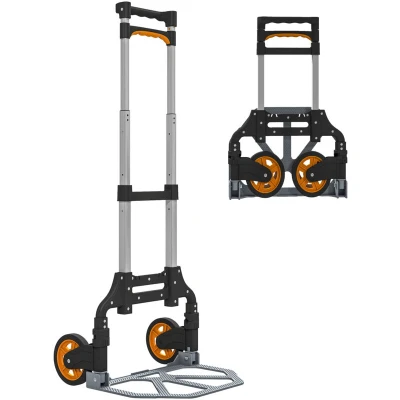 General description The HOMCOM Lightweight Sack Truck is designed to simplify the transportation of bulky boxes and heavy supplies. With its all-aluminium construction and a telescopic handle, this folding trolley can support a maximum load of 70 kg, making it ideal for various tasks. It easily folds away for convenient storage, ensuring that you can manage your moving needs without hassle. Technical specifications Colour: Silver Tone, Black, Orange Material: Aluminium Overall Dimension: 38.5L x 41W x 100H cm Folding Size: 38L x 6.5W x 63H cm Armrest Distance: 14.5 cm Handle Height: 63-100 cm Maximum Load: 70 kg Item Label: B71-071V00OG Usage Ideal for transporting heavy-duty items in garages, workshops, homes, travel, and automotive settings. Two PP wheels provide smooth and stable transport. No assembly is required, allowing for immediate use.