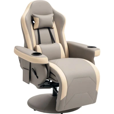 General description This HOMCOM Manual Recliner Armchair is designed for ultimate relaxation after a long day. With an adjustable footstool and a maximum reclining angle of 135°, this chair provides the perfect way to unwind. It features a full 360° swivel base for added convenience and is upholstered in soft, stylish faux leather that is easy to clean, making it ideal for busy lifestyles. Technical specifications Colour: Grey Material: Steel, Sponge, PU Upright Dimension: 106H x 82W x 80D cm Reclining Dimension: 95H x 82W x 142 cm Seat Size: 51W x 56D cm Seat Height: 49 cm Back Size: 57W x 71L cm Armrest Size: 14W x 58D x 59.5H cm Cup Holder: Φ8 x 6H cm Side Pocket: 12.5W x 14.5H cm Max Load: 130 kg Item Label: 839-167V71GY Usage 360° swivel seat for easy movement 135° reclining back for relaxation Manual footrest to elevate your legs Padded seat with head and lumbar pillows for added comfort Built-in cup holders and storage pockets for convenience