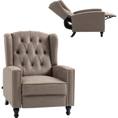 Let this HOMCOM reclining chair bring retro style and comfort into your home. Metal studding and tufting adopt a vintage look, with thick sponge filling for comfort. The metal frame is sturdy and solid in everyday use, with the back manually reclining to either 90° or 165°. It's finished with carved rubber woods, keeping the recliner chair supported and stable. Specifications: ● Colour: Brown ● Materials: Microfibre (100% Polyester), Metal, Rubber Wood ● Dimensions: 98H x 73W x 86Dcm. Reclined: 83H x 73W x 142Dcm. Seat: 46H x 51W x 56D. Back: 61H x 68Wcm ● Thickness of Seat: 15cm ● Maximum Load: 150kg ● Item Label: 833-845V70BN Features: ● Manually reclines to either 90° or 165° - the perfect place to have a rest ● Manual retractable footrest for your legs ● Thick sponge padding for comfort, high back and armrests provide support to your body ● Metal nailhead trim on the arms for added style ● Solid metal frame to keep the structure in check, with rubber wood legs to keep the chair