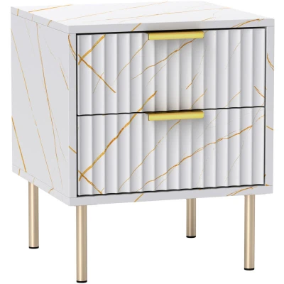 HOMCOM Marble Pattern Bedside Table, Fluted Cabinet with 2 Drawers, Side End Table Steel Legs for Bedroom, White