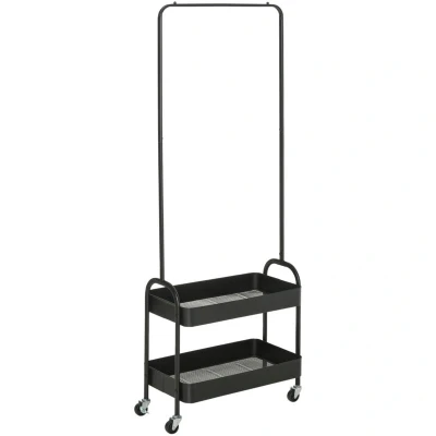 HOMCOM Metal Clothes Rack with Shoe Storage, Clothing Rail on Wheels, Freestanding Hall Tree, Coat Stand 2 Storage Shelf, Black