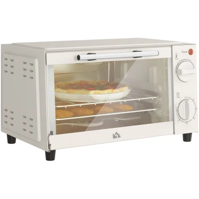 General description Whatever the space or size, it's easy to cook a wide variety of food with this HOMCOM countertop oven. It features a stylish and sleek design, making food hot and tasty anywhere you like. Technical specifications Colour: Cream White Material: Metal, Stainless Steel, Tempered Glass Overall Dimension: 35L x 24.6W x 20H cm Interior Size: 25.3L x 19.8W x 16.4H cm Door Size: 27L x 17H cm Voltage: 230V / 50HZ Cable Length: 0.9 m Capacity: 9L (fits four bread slices or a 9" pizza) Temperature Range: 100°C to 230°C Timer: 0-60 minutes Compatibility and accessories Includes a removable wire rack and baking tray (both dishwasher safe) Installation Small oven suitable for smaller kitchen and dining spaces, ideal for studio flats Usage Adjustable temperature allows for cooking different types of food in various ways Front clear glass window for easy monitoring of cooking progress Bottom plate can be pushed outwards for easy cleaning Other information Certification: CE-EMC,