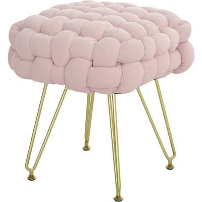 HOMCOM Modern Foot Stool, Woven Velvet Footstool with Metal Legs, Padded Seat for Living Room, Bedroom, Entryway, Pink